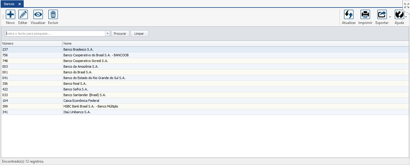 Número – Informe o número do banco de acordo com a FEBRABAN (Federação Brasileira de Bancos).