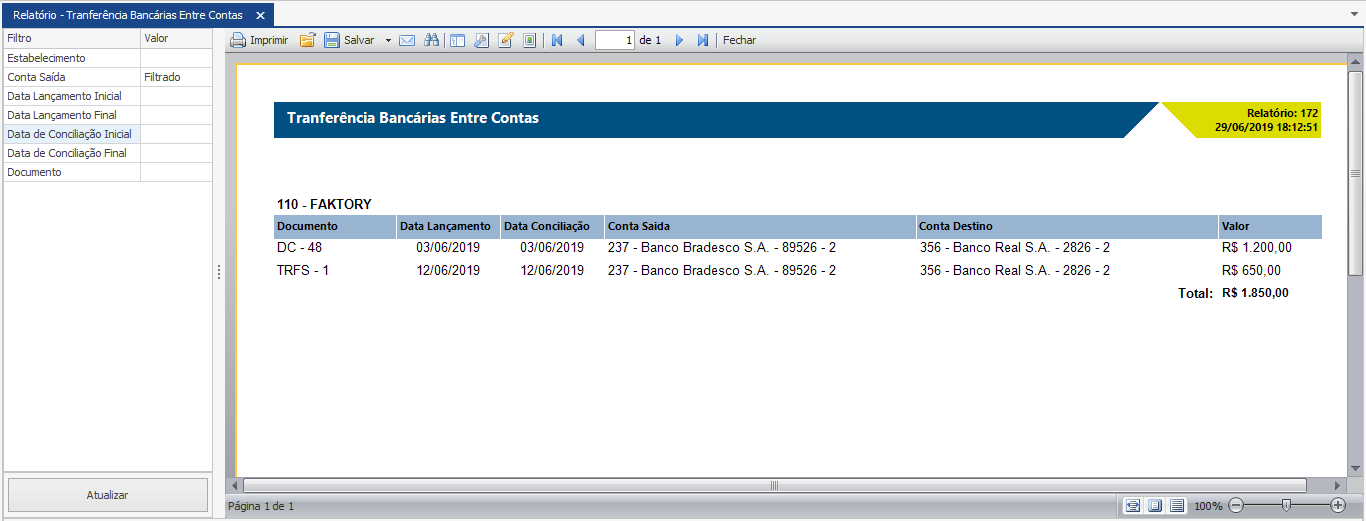 O relatório de “Transferências Bancárias entre Contas” traz todas as transferências bancárias realizadas entre as contas de um mesmo estabelecimento. Este relatório pode ser muito útil quando a empresa deseja verificar as movimentações entre as contas correntes e contas garantida ou aplicação, por exemplo.