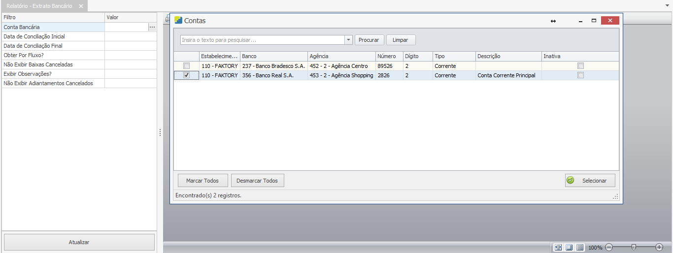 No exemplo acima utilizamos o filtro de “Conta Bancária”, para selecionar a conta bancária desejada, marque a flag na caixa de seleção e em seguida clique no botão “Selecionar”. Também temos os filtros que possuem uma checkbox para ser marcada com uma flag. Veja exemplo abaixo:
