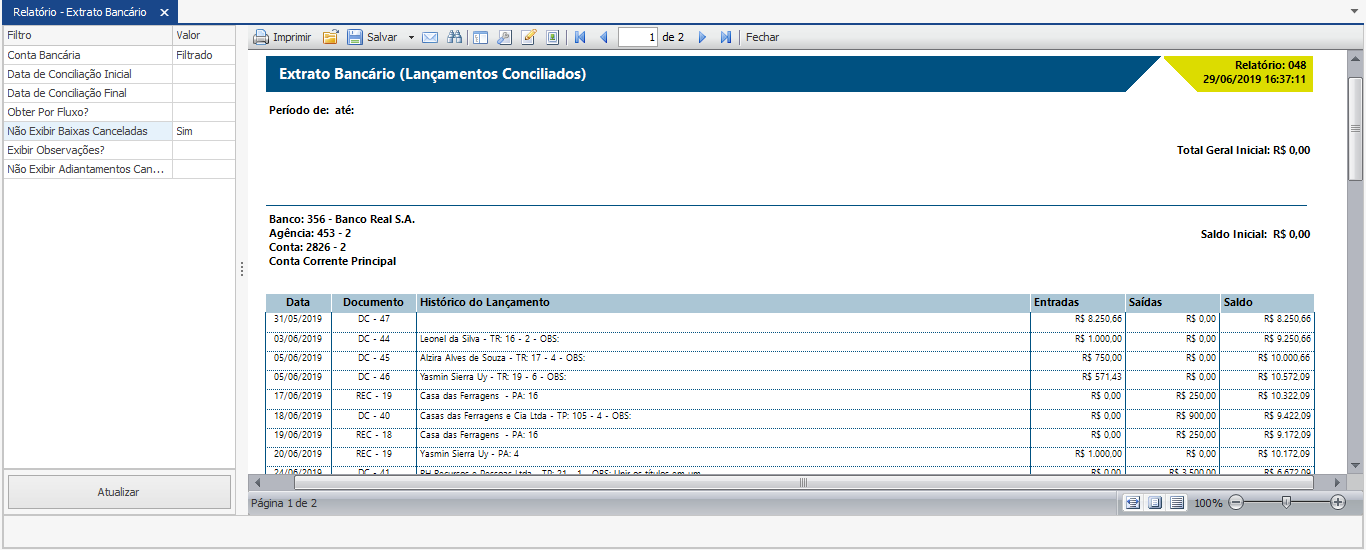 O relatório de “Extrato Bancário” traz todos os lançamentos bancários conciliados em formato de extrato de banco. O relatório traz os principais dados dos lançamentos em ordem cronológica e formam assim a composição do saldo atual. Este relatório é um espelho da tela de consulta vista anteriormente. O relatório pode ser utilizado para comparar os lançamentos do sistema com o extrato bancário emitido pela instituição financeira.
