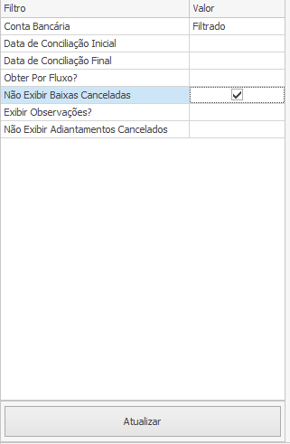 Data de Conciliação Inicial – Determina a data inicial para exibição dos lançamentos com base na data de conciliação.