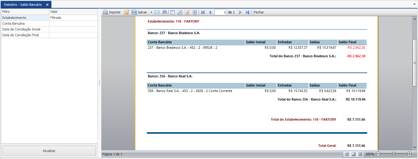 Veja abaixo um exemplo do relatório “Saldo Bancário” com o filtro “Estabelecimento” selecionado.