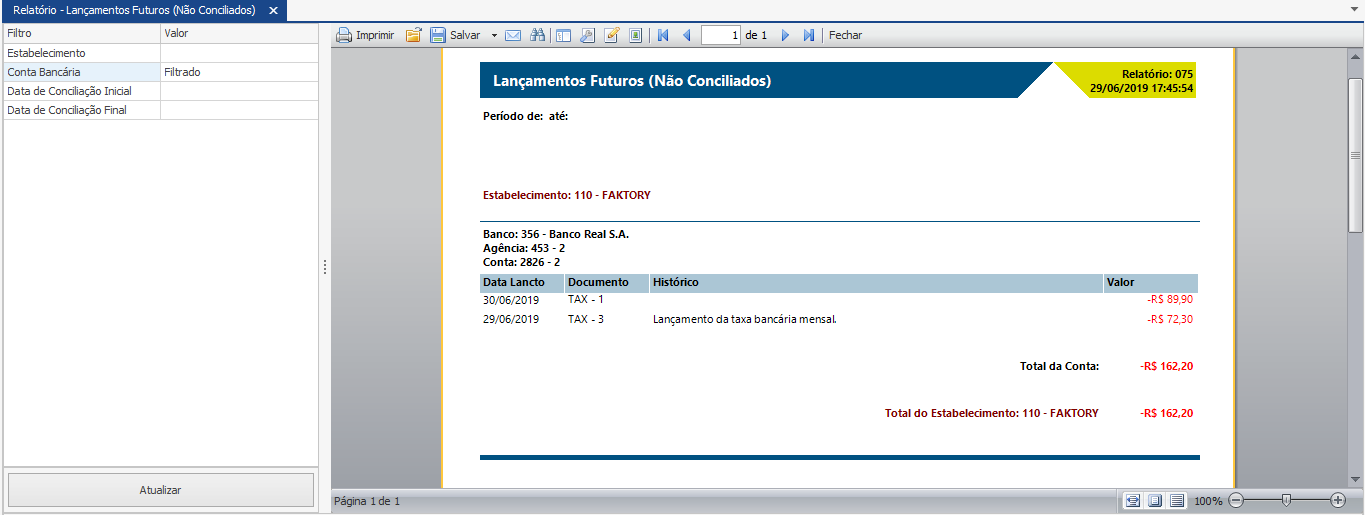 No relatório de “Lançamentos Futuros (Não Conciliados)” encontram-se todos os lançamentos bancários na qual não foram informados data de conciliação. Este relatório pode ser utilizado para o usuário conferir os lançamentos que ainda não foram confirmados no extrato do banco.