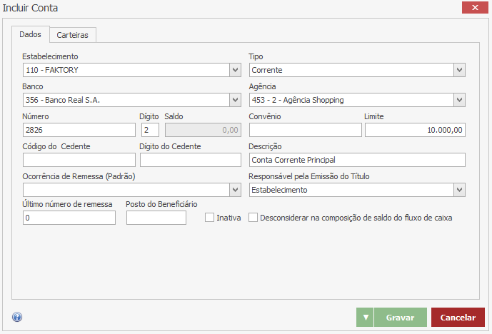 Flag Inativa – Marque a flag para que essa conta seja bloqueada, impedindo assim qualquer movimentação financeira vinculada a ela. Neste nosso exemplo deixaremos a flag desmarcada.