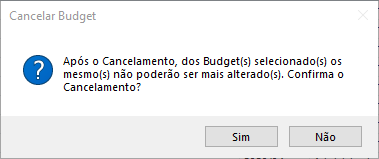 Após finalizado, o Budget não pode ser mais excluído, somente cancelado. Para isso, selecione o Budget finalizado, vá em Ações > Cancelar. Irá aparecer uma mensagem de confirmação, clique em “Sim”: