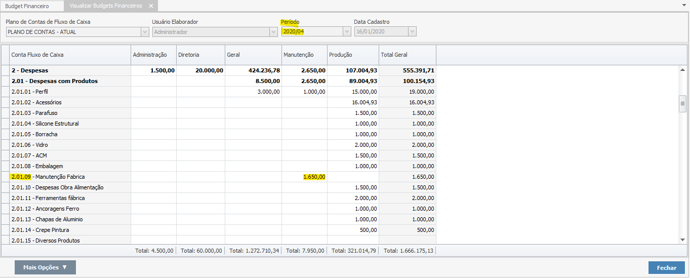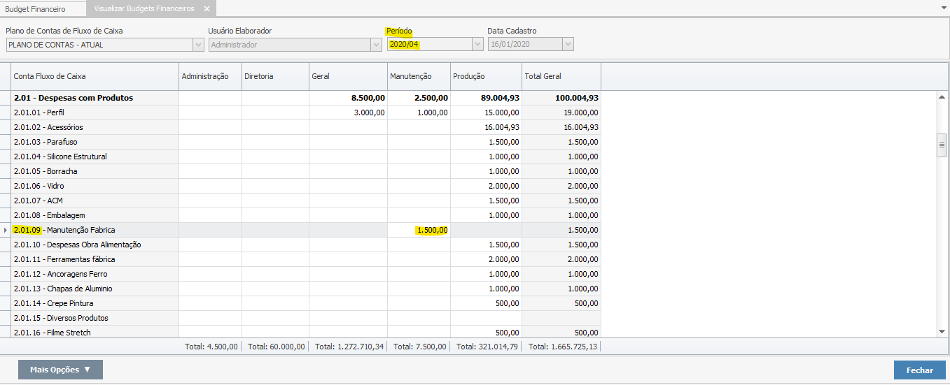 Uma vez que o Budget é finalizado, não é mais possível editar os valores informados, podendo ser feito apenas o reajuste desses valores. Esse reajuste pode ser feito de uma conta ou departamento específico ou geral, para todas as contas com valores dentro do budget. No exemplo, irei fazer de uma conta individual, a conta “2.01.09 – MANUTENÇÃO FABRICA”. Repare que o valor dela, no Budget de abril 2020 está em R$ 1.500,00: