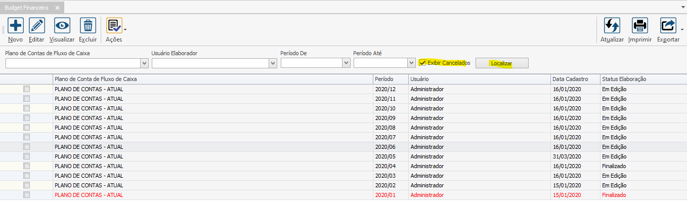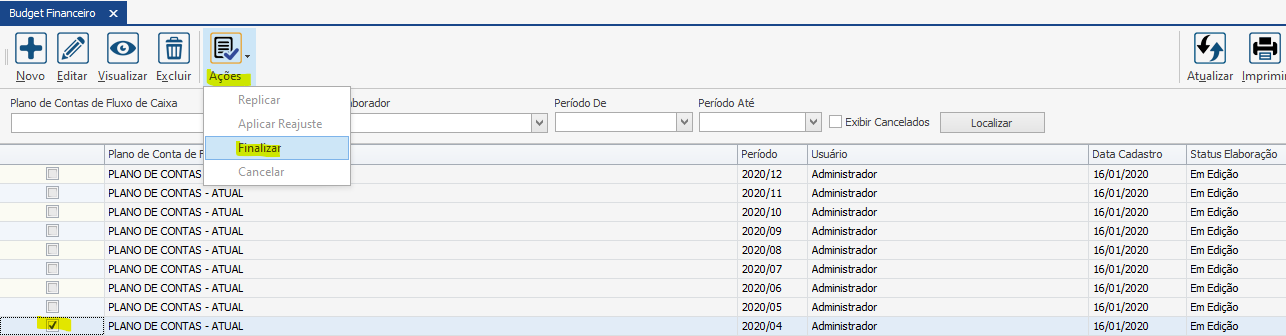 Após realizar a elaboração do Budget, deve-se finaliza-lo para que as outras opões do botão “Ações” fiquem disponíveis para uso. Para isso, selecione o Budget, vá em Ações > Finalizar.