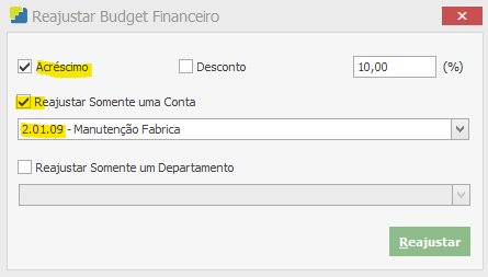 Ao selecionar o Budget, vá em Ações > Aplicar Reajuste, irá abrir a tela abaixo. Selecione se deseja informar um acréscimo ou desconto, no exemplo irei aumentar o valor, então selecionei “acréscimo”, qual o percentual desse acréscimo/desconto, e como eu quero reajustar somente uma conta especifica, eu marco a opção “Reajustar somente uma conta” e informo qual a conta a ser reajustada (2.01.09) e clico em “Reajustar”.