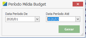 Também é possível realizar a importação média dos valores, para que o sistema preencha automaticamente com os valores gastos durante o período informado. Essa opção está disponível no botão Mais Opções > Importar Média de Valores. Na tela que abrir, informe qual o período que o sistema irá analisar e calcular a média para o novo Budget. No exemplo, como estou fazendo de Abril de 2020, vou pegar a média dos 3 primeiros meses, por isso informei 01/2020 até 03/2020. Clique em “Gerar”.