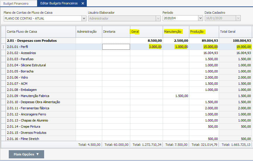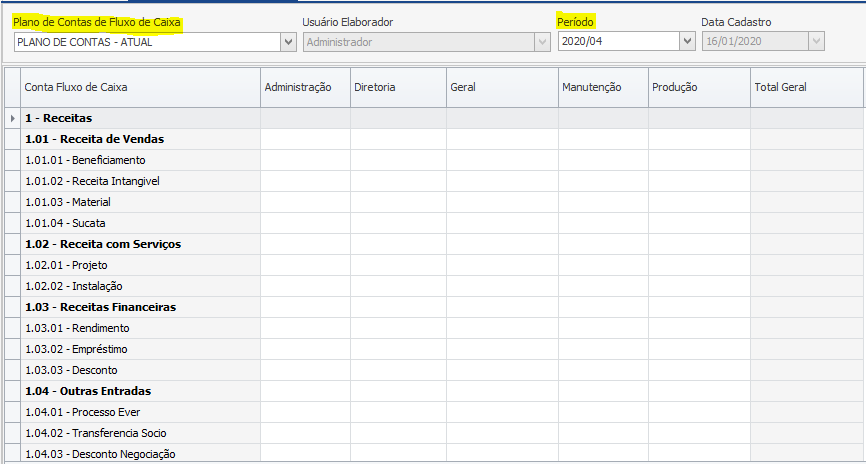 Para elaborar um novo budget, iremos usar o plano de contas do fluxo de caixa em vigor na empresa.