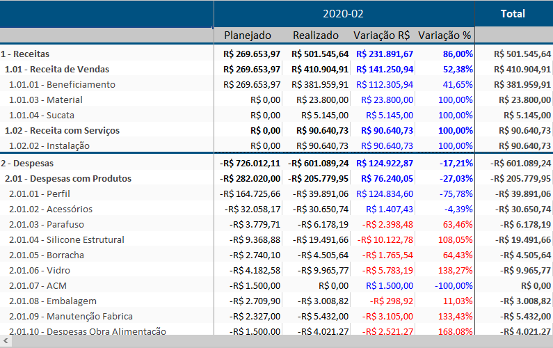 O sistema irá mostrar o budget na coluna “Planejado” e o realizado na coluna “Realizado”. Na coluna “Variação R$” o sistema irá mostrar a diferença em Valores e na coluna “Variação %” irá mostrar a diferença em percentual. As contas em Azul significam que você ainda está dentro do valor planejado e as contas em vermelho significam que o valor planejado já foi ultrapassado: