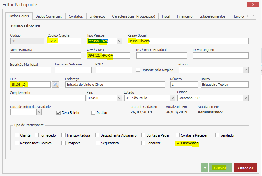 Acesse o menu Cadastros > Participantes > Participantes. Na tela que abrir, clique em “Novo” e coloque os dados do colaborador. Atenção para o “Código do Crachá” e a flag “Funcionário” nessa tela de cadastro: