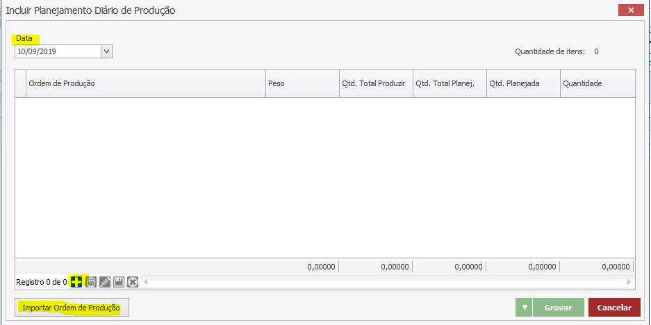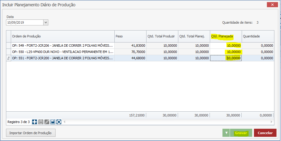 Voltando para a tela de planejamento, nós ainda podemos alterar a quantidade que estamos planejando produzir no dia. Para isso é só alterar a quantidade da coluna “Qtd. Planejada”. Nesse nosso exemplo, será feito a quantidade total. Depois clique em “Gravar”.