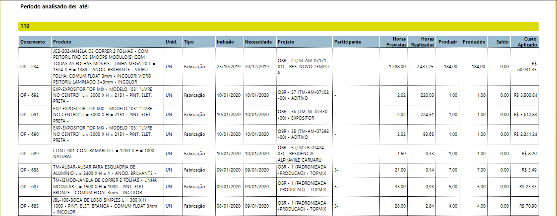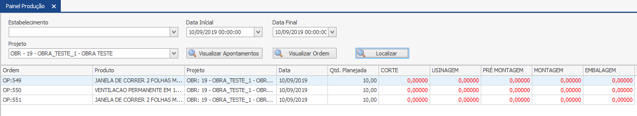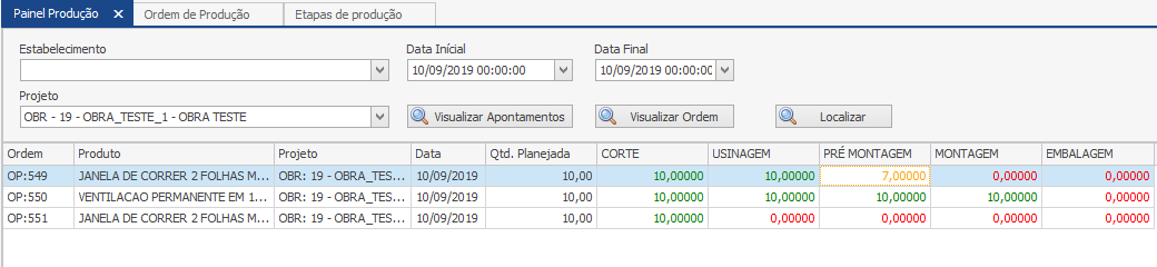 Conforme os apontamentos são realizados, e as etapas vão avançando, é possível saber em qual etapa determinada a ordem está. Nesse nosso exemplo, a OP 549 foi liberada somente 7 unidades para a Montagem, faltando ainda realizar a Pré-Montagem de 3 unidades. A OP 550 já terminou a maioria dos processos, restando somente ser embalada. Já a OP 551 foi somente cortada, precisando ser usinada.
