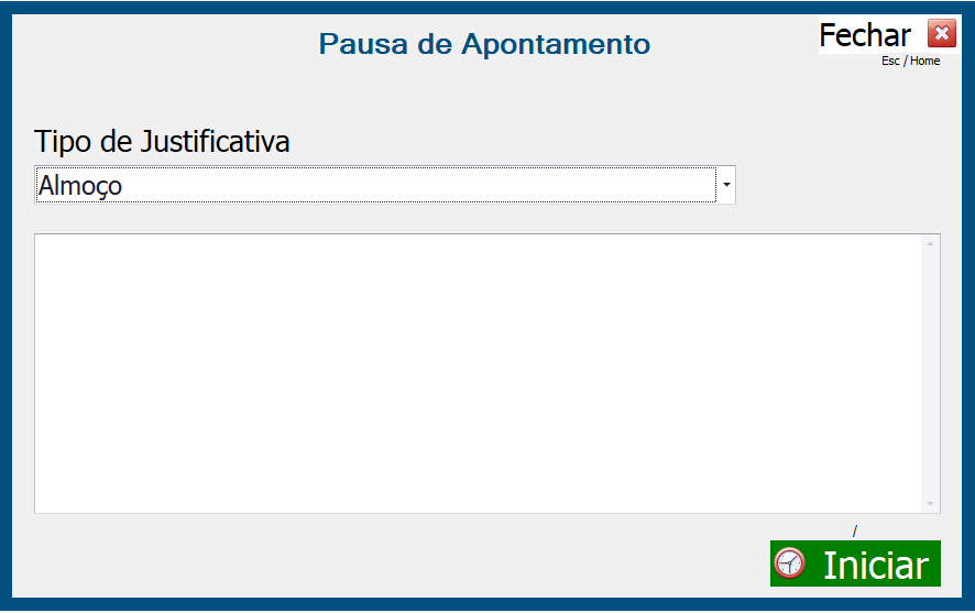 Na tela que abrir, coloque a Justificativa (cadastrada no passo 3.6 desse manual) e clique em “Iniciar”: