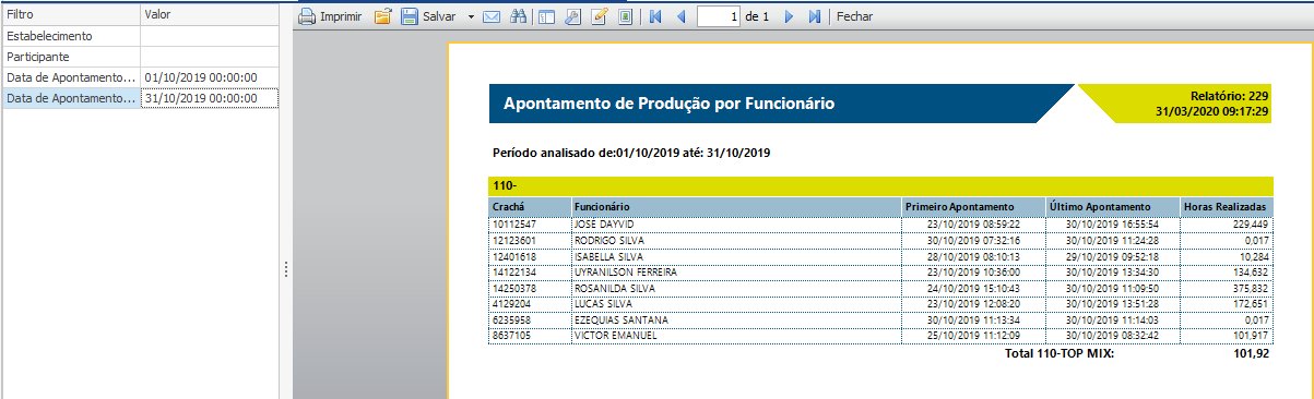 Disponível no menu Estoque > Relatórios > Apontamento de Produção por Funcionário. Nesse relatório podemos filtra um período (no exemplo, filtrei o mês de Outubro de 2019) e analisarmos a quantidade de horas apontadas por funcionário no período informado: