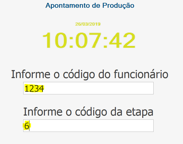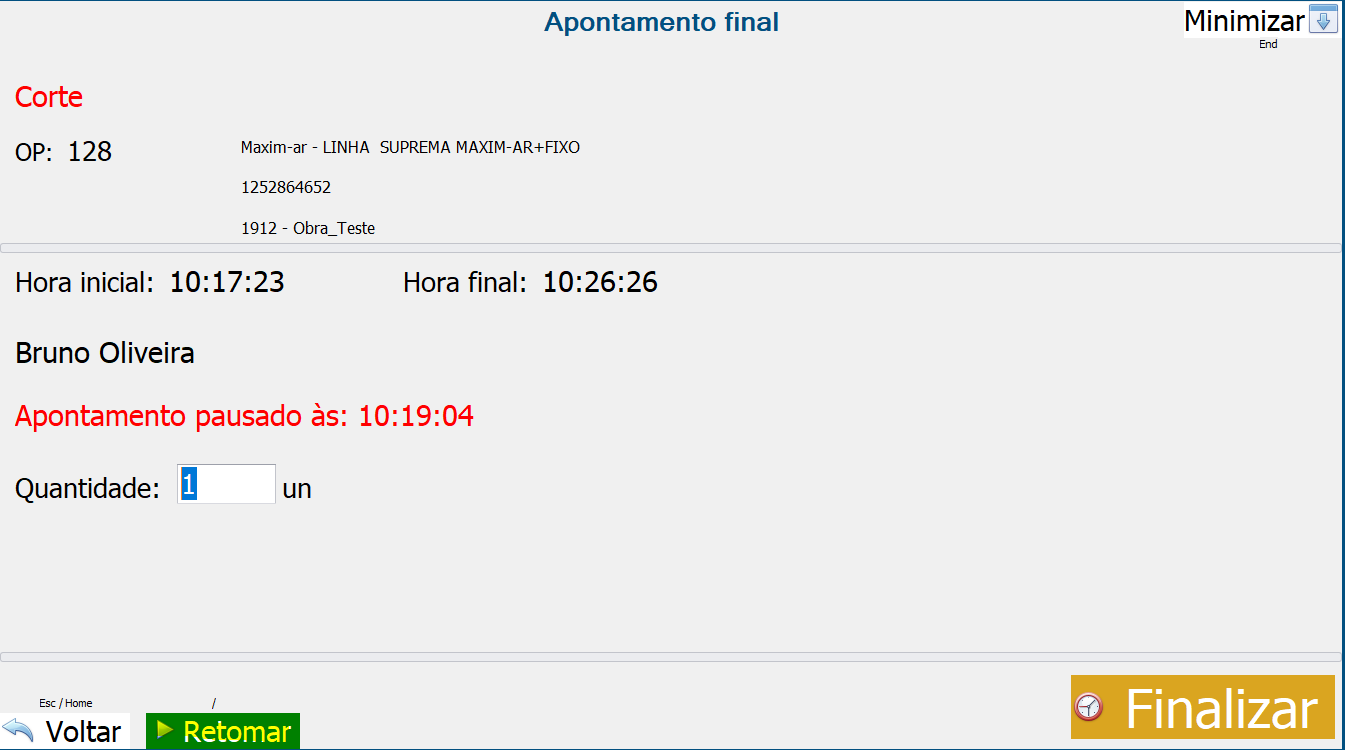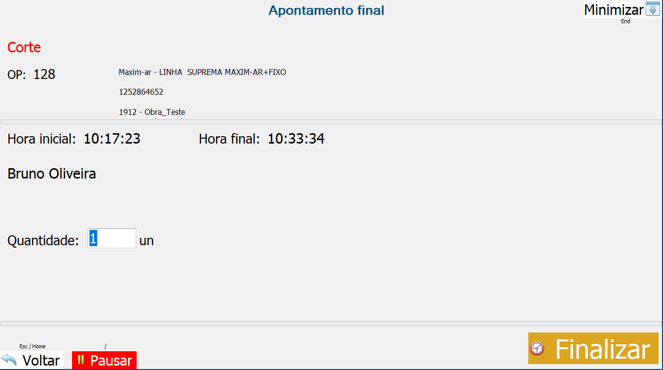 Após o término dessa etapa, basta colocar as informações novamente no apontamento (código do funcionário + etapa), confirmar a quantidade e clicar em “Finalizar”: