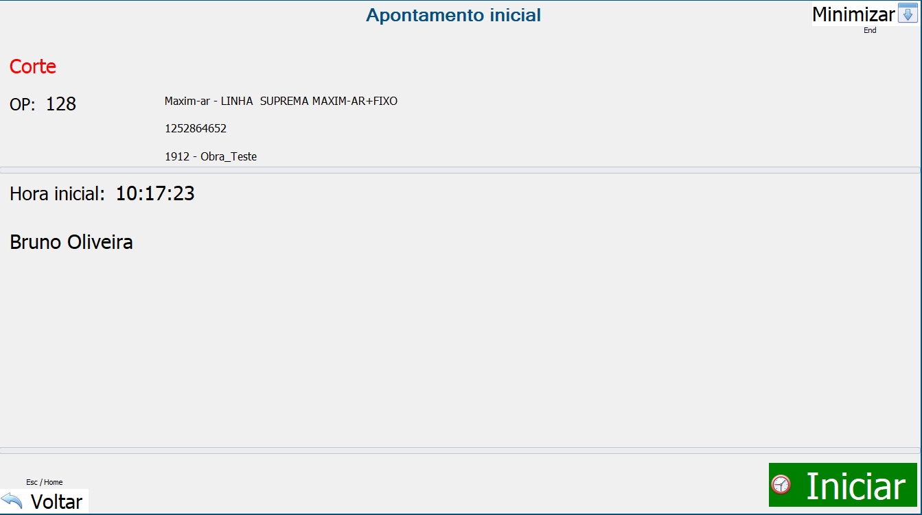 Nesse exemplo, coloquei o código 1234 do crachá do funcionário cadastrado no passo 3.2 desse manual e da etapa 6 correspondente a etapa Corte da ordem de Fabricação. Ao clicar em “Iniciar” será dado inicio a contagem de tempo desse processo: