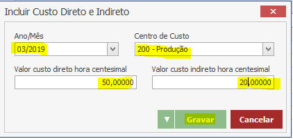 Após o cadastro do Centro de Custo, devemos colocar o custo direto e indireto. Para isso, acesse o menu Cadastros > Produtos > Custos Diretos e Indiretos. Na tela que abrir, clique em “Novo” e preencha os campos em destaque: