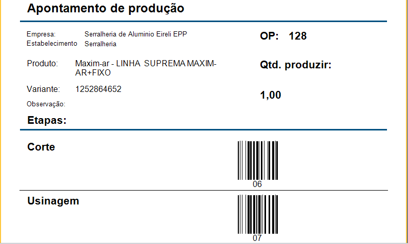 Acesse o menu Estoque > Ordem de Produção. Selecione a(s) ordem(ns) que você deseja imprimir as etapas de produção, vá em Emissão > Etapas de Produção. Cada etapa terá um código de barras para apontamento via leitor e o número em baixo para apontamento manual.