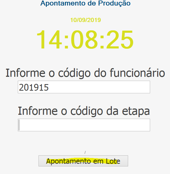 Observação: No apontamento por lote, não existe o botão Pausa. Se for necessário que o colaborador pare, deve ser feito o apontamento do lote e finaliza-lo. Após o retorno da pausa, deve ser feito o apontamento do lote novamente e inicia-lo.
