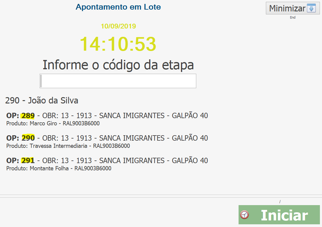 Na próxima tela, o usuário poderá colocar várias ordens de produção de uma única vez, desde que sejam da mesma etapa. Por exemplo, apontei abaixo as ordens 289, 290 e 291 da etapa CORTE. Após colocar todas as ordens que serão realizadas juntas, clique em “Iniciar”.