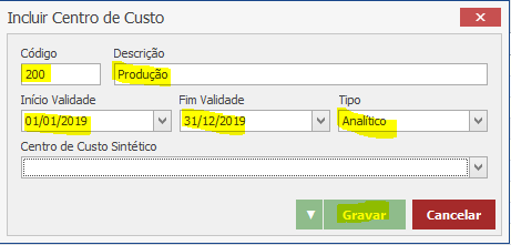 Acesse o menu Cadastros > Contabilidade > Centro de Custo. Na tela que abrir, clique em “Novo”. Preencha os campos em destaque e clique em Gravar. Se houver mais de um centro de custo, repita o procedimento: