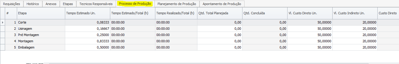 Dessa forma, se clicarmos na aba Processo de Produção, poderemos ver as etapas dessa ordem:
