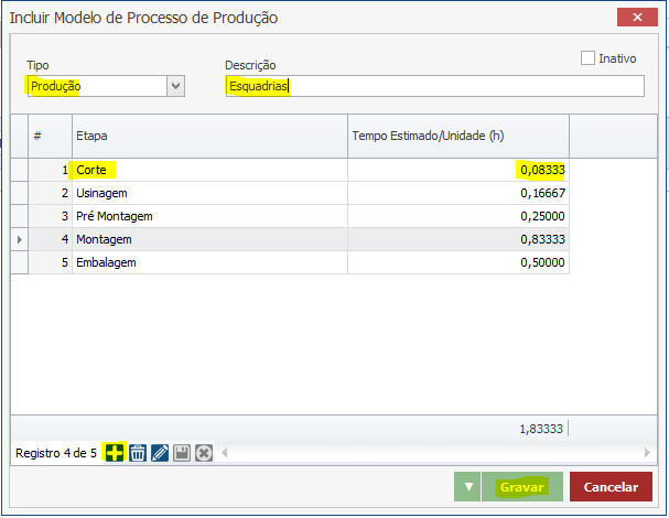 Atenção: O tempo deve ser colocado em Centesimal. No exemplo, eu criei 5 etapas, com seus respectivos tempos: