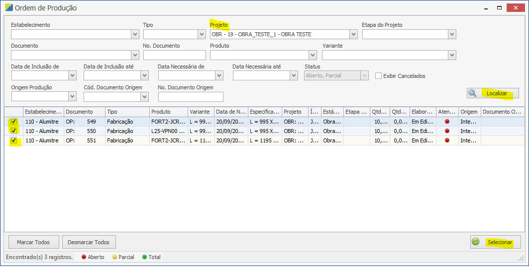Na tela que abrir, é possível realizar filtros para selecionar as ordens que são de sua preferência. Eu filtrei pelo projeto e irei adicionar as 3 ordens de fabricação. Para isso eu coloquei o projeto OBRA_TESTE_1, cliquei em “Localizar”, marquei as 3 ordens de fabricação e depois cliquei em “Selecionar”: