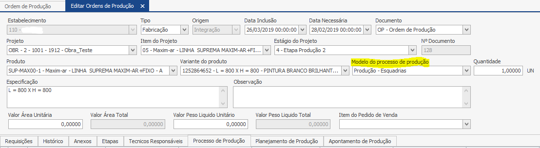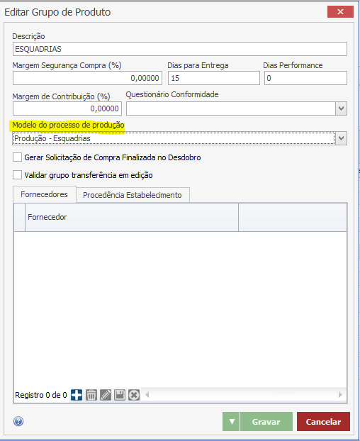 Caso o Modelo de processo de produção não tenha vindo preenchido da integração, podemos preencher com o processo correspondente. Basta colocar o modelo nesse mesmo campo destacado acima e clicar em “Gravar”.