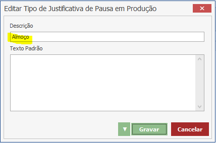 No apontamento de produção, será possível que o colaborador faça pausas durante o processo de produção. É necessário cadastrar essas pausas dentro do Faktory, para puxarmos na tela de apontamento. Para cadastrar uma nova Justificativa, acesse o menu Cadastros > Diversos > Tipos de Justificativas. Coloque a Descrição e se preferir, um texto padrão para a justificativa. Depois clique em “Gravar”:
