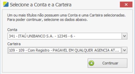 O sistema solicitará a conta e carteira responsáveis pela emissão do boleto. Ao clicar em “Continuar” a emissão do boleto será feita.GERAÇÃO DE ARQUIVO REMESSA