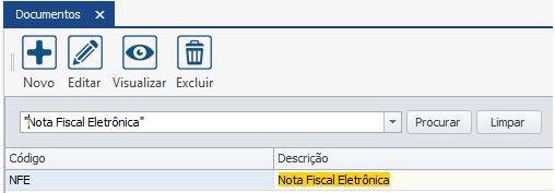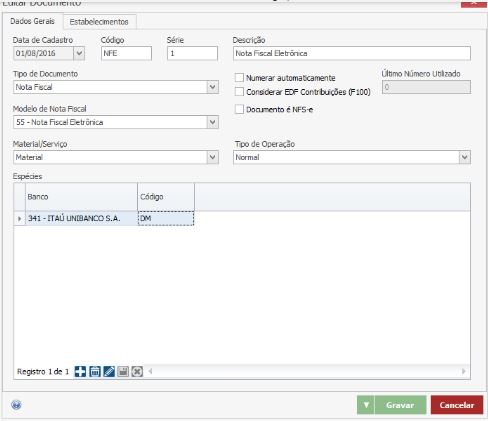 No cadastro do documento deve-se vincular a espécie do documento. Para isso acesse Cadastros > Diversos > Documentos. Procure pelo documento NFE (ou outro que seja utilizado nas emissões de notas) e clique no botão “Editar”.Na tela de edição, no campo “Espécie”, informe o banco e código da espécie, conforme mostra a imagem abaixo.
