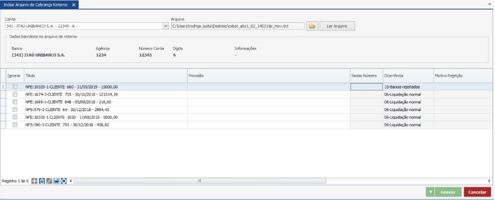 Informe a conta e em seguida procure o arquivo que está salvo no computador. Em seguida clique em “Ler Arquivo”. Os títulos serão carregados na tela. Clique em “Gravar”.