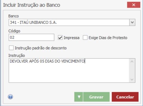 Perceba que no exemplo foi selecionado a flag “Impressa”, pois de acordo com o layout mostrado acima essa instrução deve ser impressa no boleto. Caso seja uma instrução de protesto, deve-se selecionar a flag “Exige Dias de Protesto”. O mesmo vale para a opção “Instrução Padrão de Desconto”.