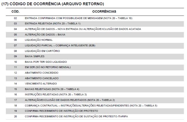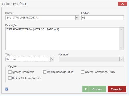Para cadastrar as ocorrências também é ideal que se tenha em mãos o layout do banco. Segue um exemplo de ocorrências de retorno do layout CNAB 400 do Banco Itaú:Para cadastrar acesse Cadastros > Bancos > Ocorrências. Nessa tela serão cadastradas ocorrências de Remessa e Retorno. Clique no botão “Novo”.
