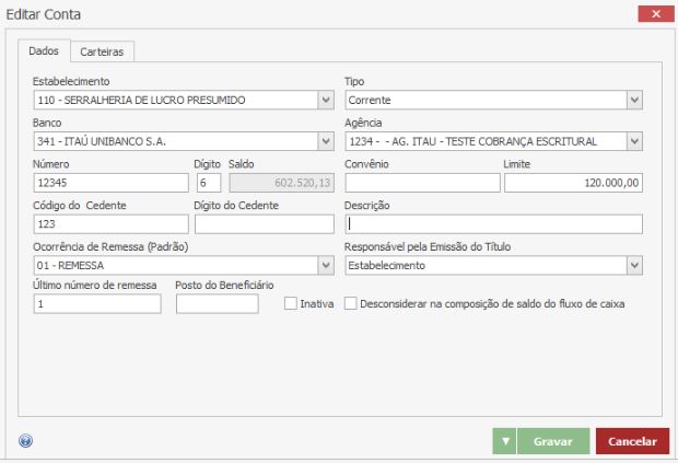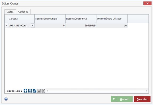 Número Convênio (normalmente obrigatório apenas para o Banco do Brasil)Na aba “Carteiras” será possível vincular as carteiras à conta. Também deverá ser informado o Nosso Número inicial, final e o último utilizado, para os casos de a empresa já ter gerado boletos por outro sistema.