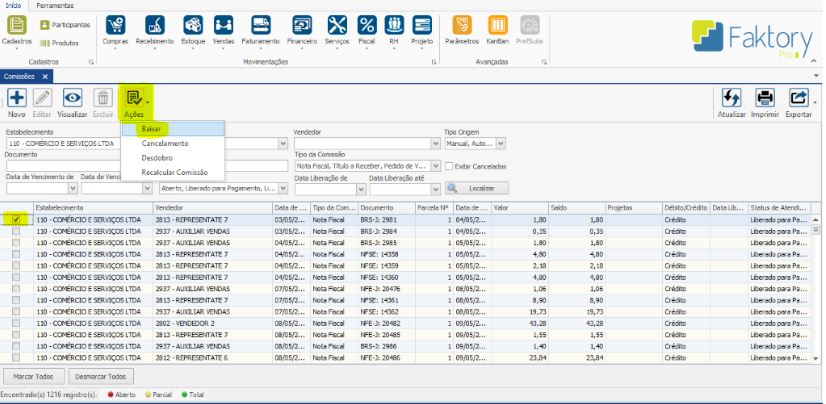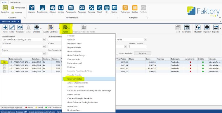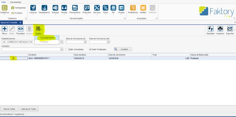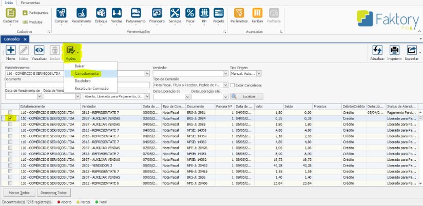 Havendo ocorrido a geração de uma Comissão incorretamente, e está não será utilizada é possível efetuar seu cancelamento. Na tela de Comissão, selecione a Comissão desejada e clique em AÇÕES > CANCELAMENTO.