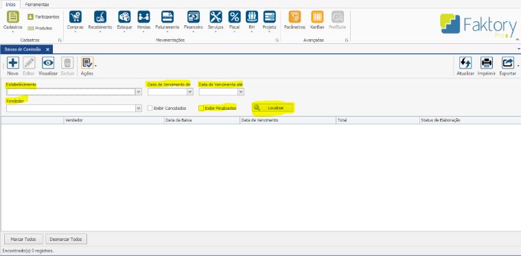 Na tela de Baixa de Comissões é possível utilizar os filtros: Estabelecimentos, Data de Vencimento De/Até e Vendedor para refinar a busca, facilitando encontrar a Baixa desejada. A flag “EXIBIR FINALIZADOS” deve estar marcada. Depois clique em LOCALIZAR.