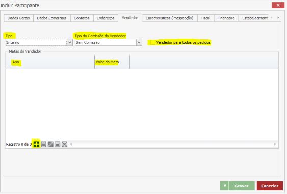 No cadastro de Participantes há dois pontos que devem ser configurados para a correta utilização da Comissão, sendo eles: o cadastro do Vendedor e o cadastro do Cliente, ambos Participantes.Dentro da aba Vendedor, preencha os campos conforme destacados na imagem: