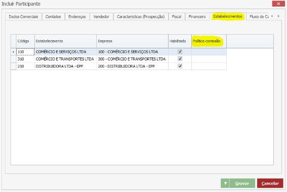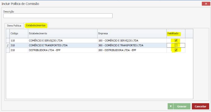 No campo Habilitado deve ser marcada a flag somente dos Estabelecimentos em que a Política de Comissão será utilizada.