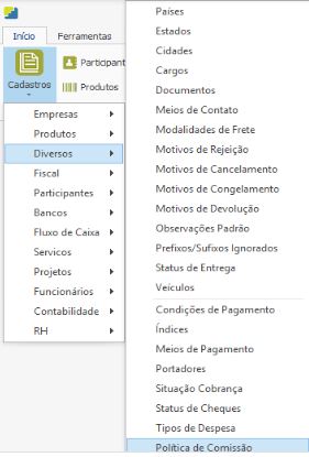 Para efetuar o cadastro da Política de Comissão, acesse o módulo de Cadastros > Diversos > Política de Comissão.