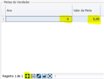 No quadro Metas do Vendedor, é possível informar dados de Ano e Valor de Meta (vendas) que o Vendedor tem a cumprir na empresa. Tais informações serão utilizadas para compor determinados relatórios. Para inserir Ano e Valores de Metas clique no botão NOVO para criar a linha e digite os campos.
