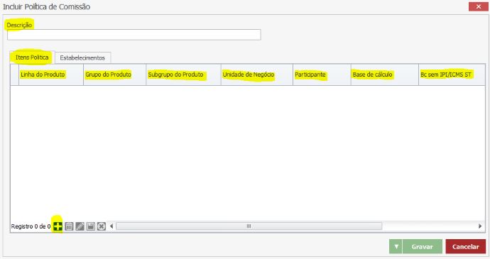 Será exibida a tela de Incluir Política de Comissão. Preencha os campos conforme destacados na imagem abaixo: