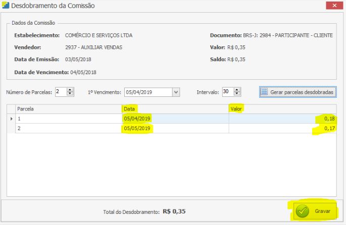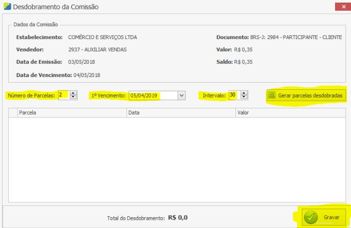 Será exibida a tela Desdobramento da Comissão. Preencha os campos conforme destaque na imagem abaixo: