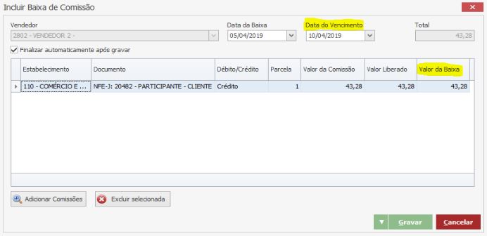 Data de Vencimento: selecione a data de vencimento da Comissão.