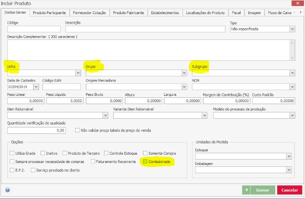 No cadastro do Produto há informações importantes que podem fazer a diferença no momento do cálculo da Comissão.