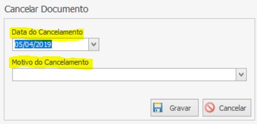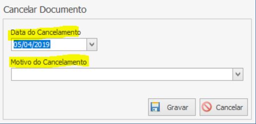 Será exibida a tela de Cancelar Documento. Informe a Data do Cancelamento e o Motivo do Cancelamento.