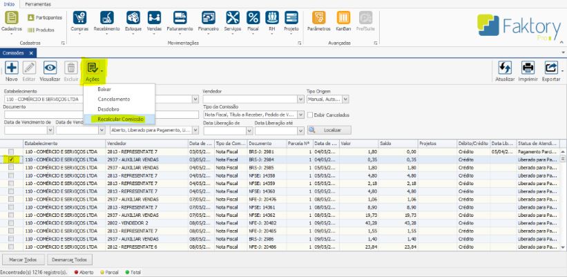 Obs.: o novo Valor Total da Comissão é formado por: Valor Atual da Comissão x Fator Recalculo e este recurso somente poderá ser utilizado para Comissões com Status em Aberto ou Liberado para Pagamento.